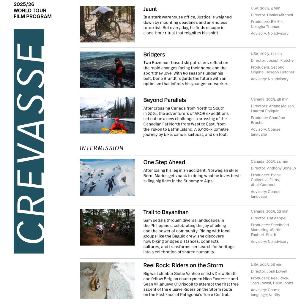 Join us for the Banff Centre Mountain Film Festival World Tour, where you’ll stand on the highest peaks, ski the steepest slopes, and experience gripping adventures from around the globe. From remote landscapes to adrenaline-fueled action sports, the 2025/2026 World Tour films will captivate and inspire you. Be moved. Be amazed. Be inspired.