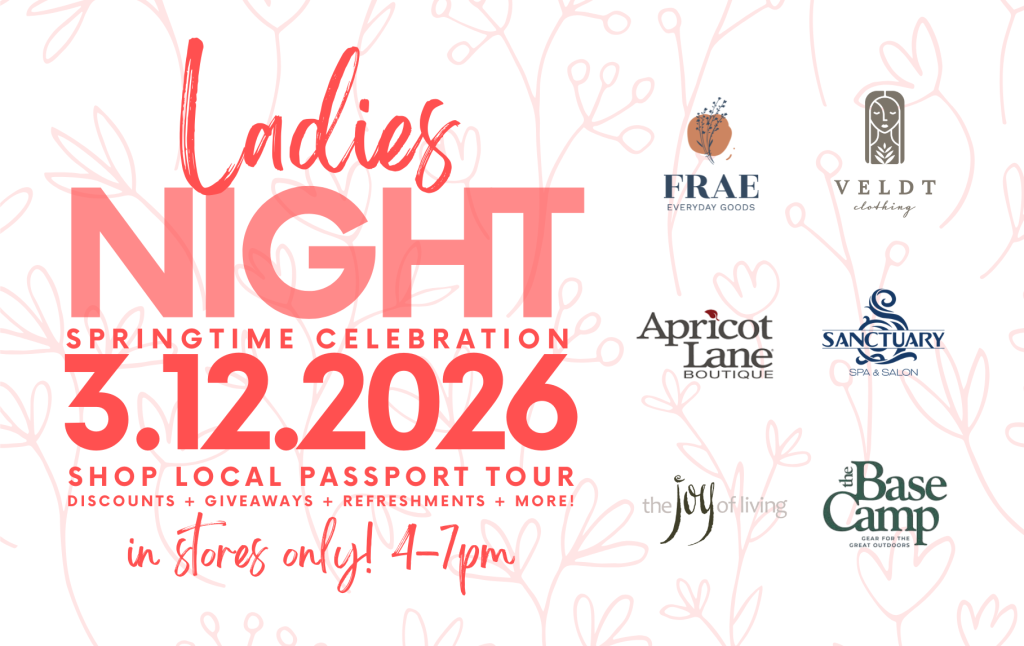 Be sure to grab a Ladies’ Night passport at your first store! Get it stamped at each location, and once you’ve visited them all, you’ll be entered to win a FREE gift basket filled with amazing items from every participating business.